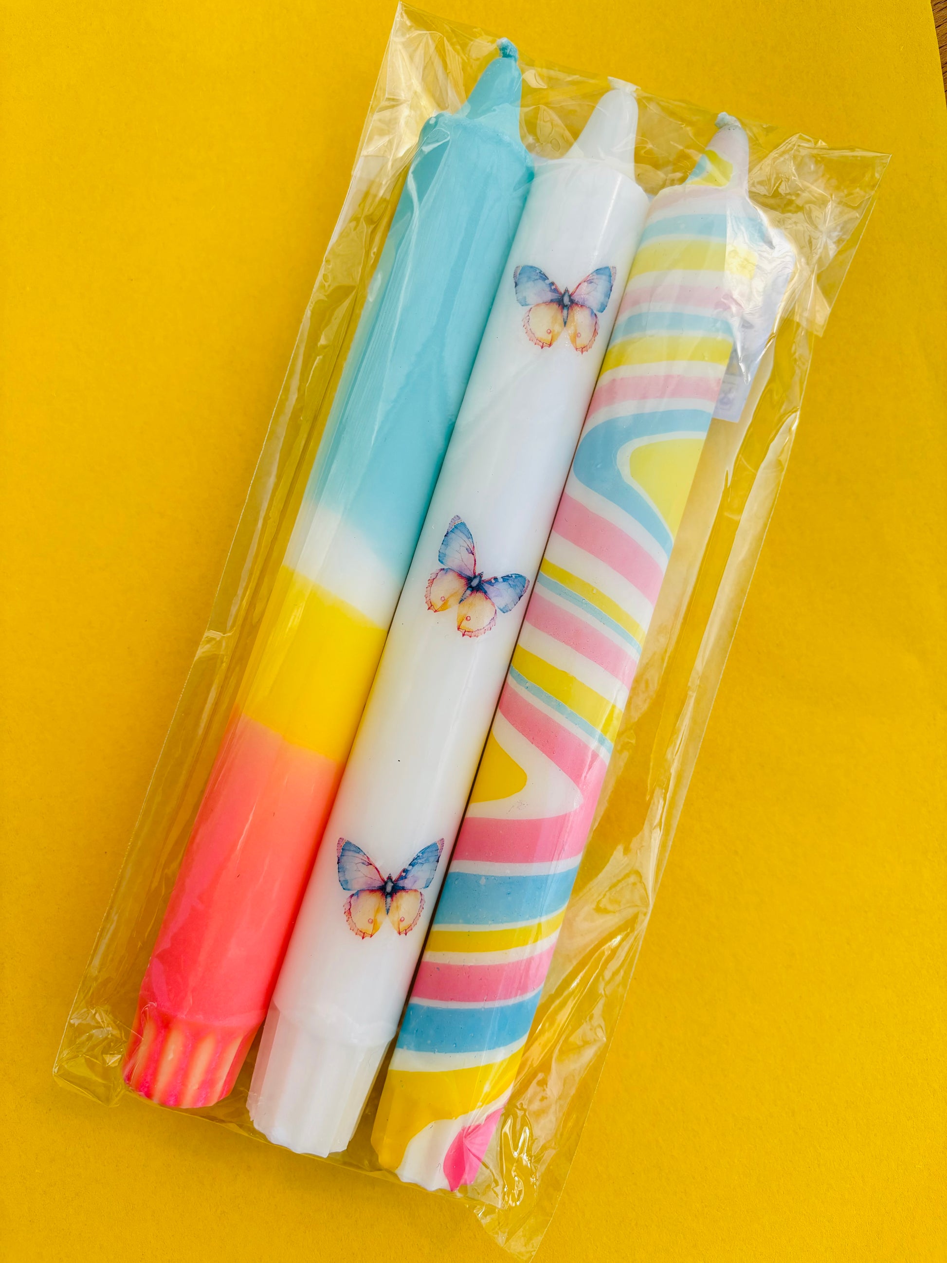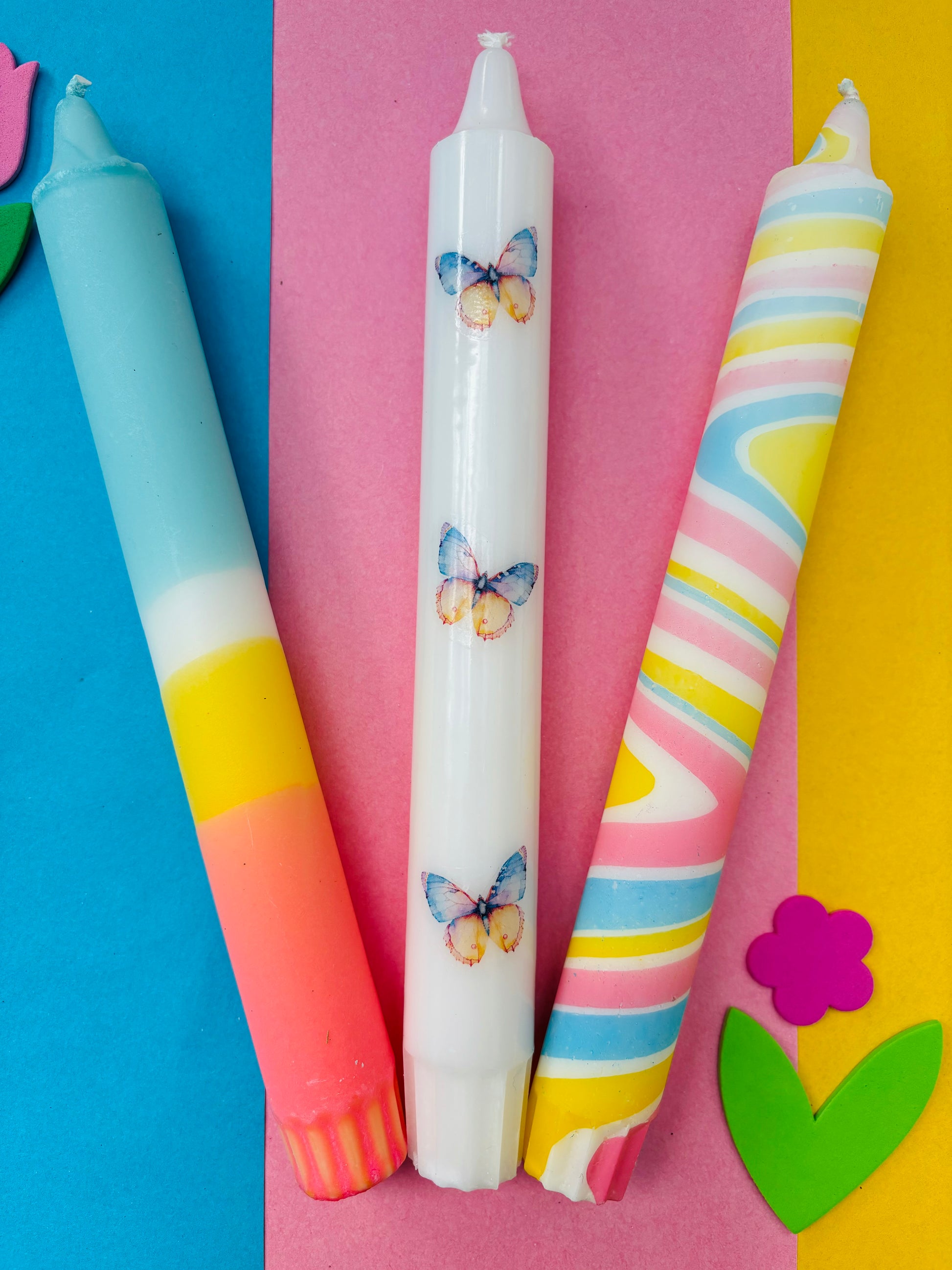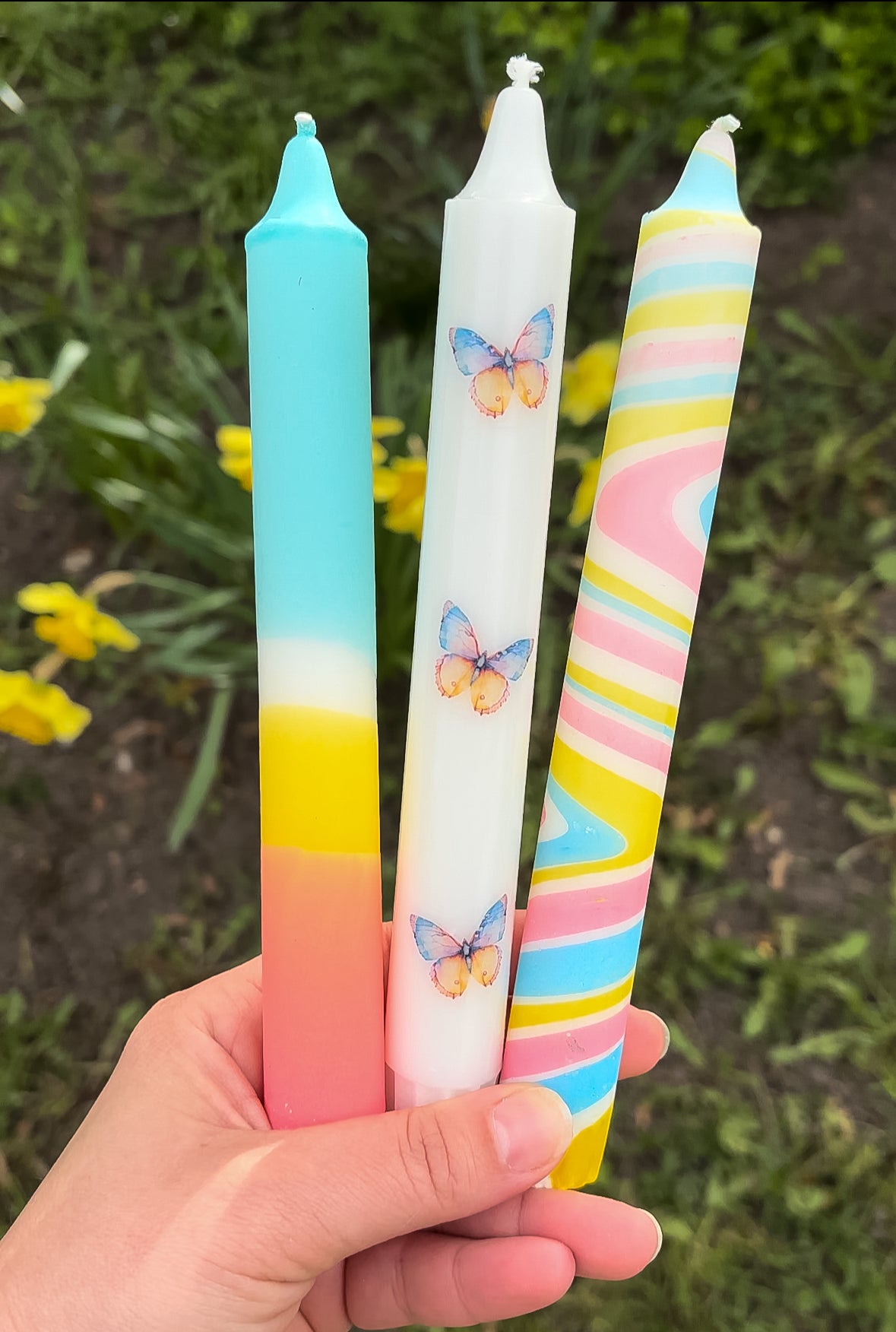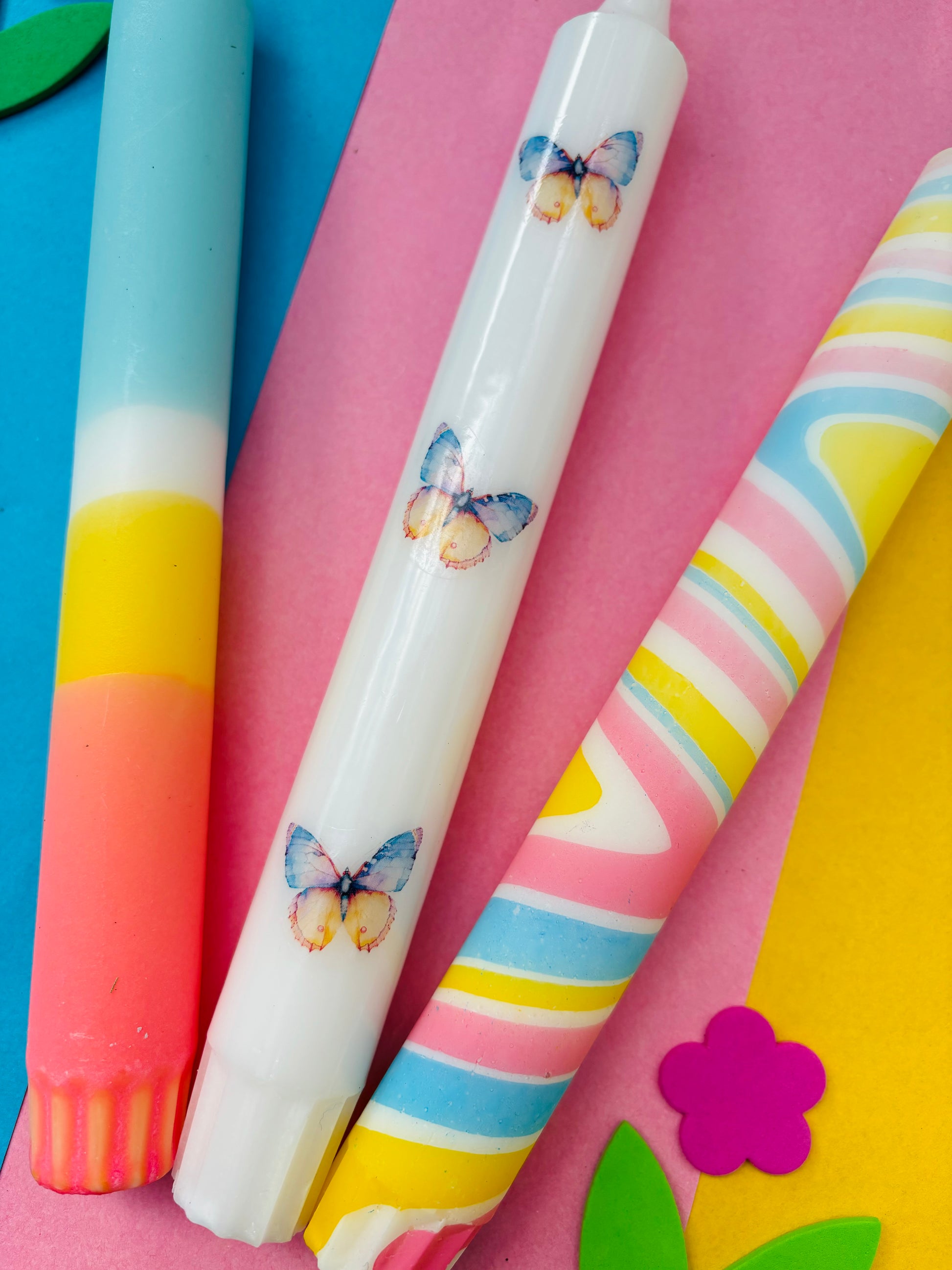 Let the joy of spring take flight with this playful set of butterfly themed candles. Dressed in cheerful pastel shades of light blue, pink, and yellow, each candle captures the lightness and freedom of butterflies dancing through a blooming garden. Perfect for adding a splash of color and whimsy to your spring decor. Ideal for celebrations, creative spaces, or any moment that calls for a little extra light and happiness.