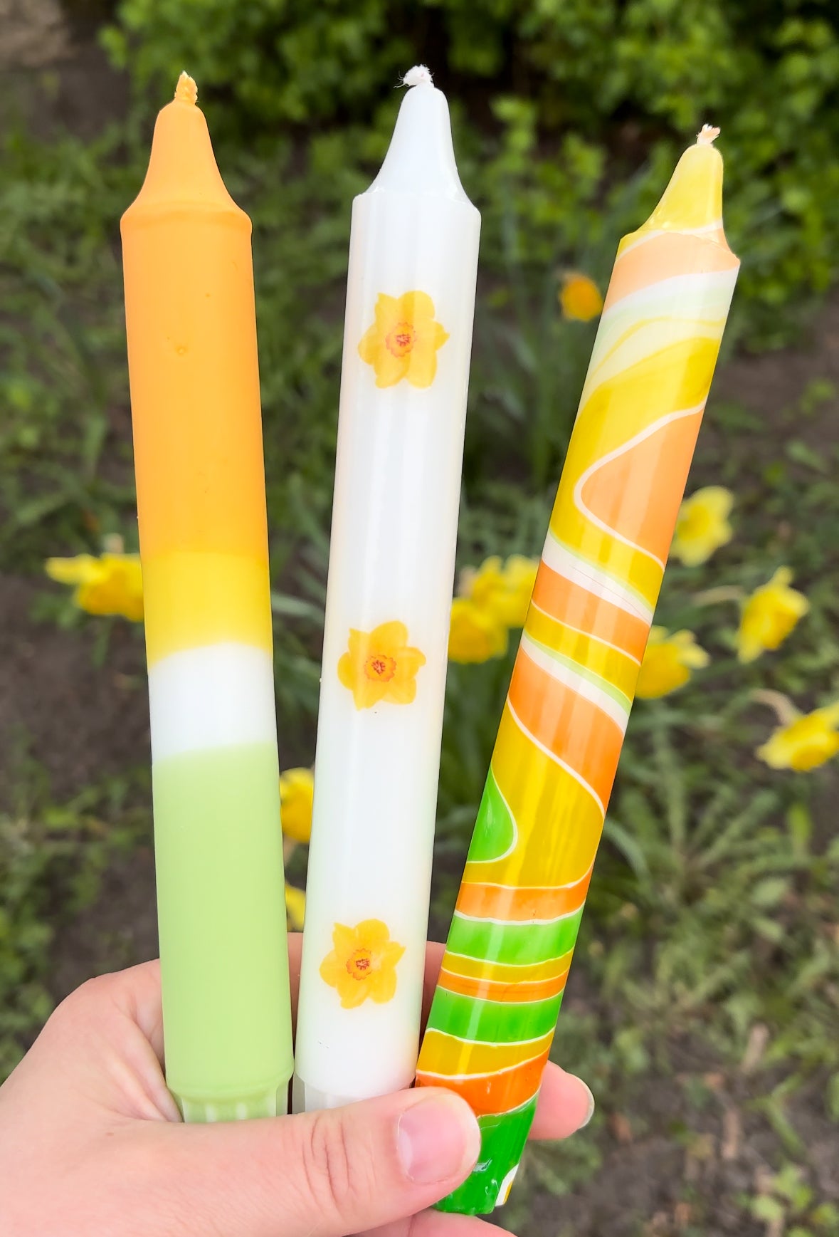 Add a splash of spring to your space with this joyful 3-pack, inspired by the first daffodils of the speing season. Dressed in cheerful colors and hand-applied daffodil patterns, these candles are made to catch the eye and lift the mood.