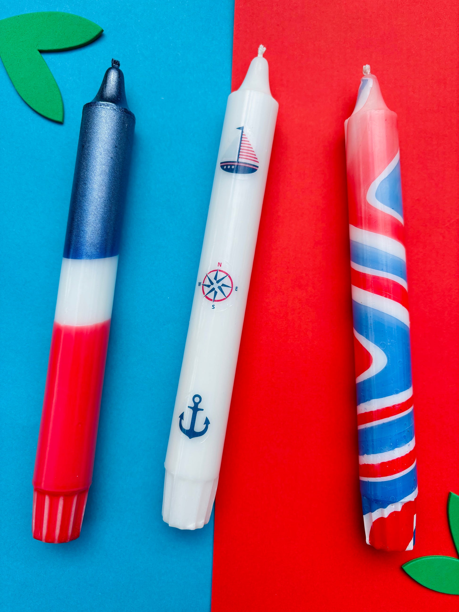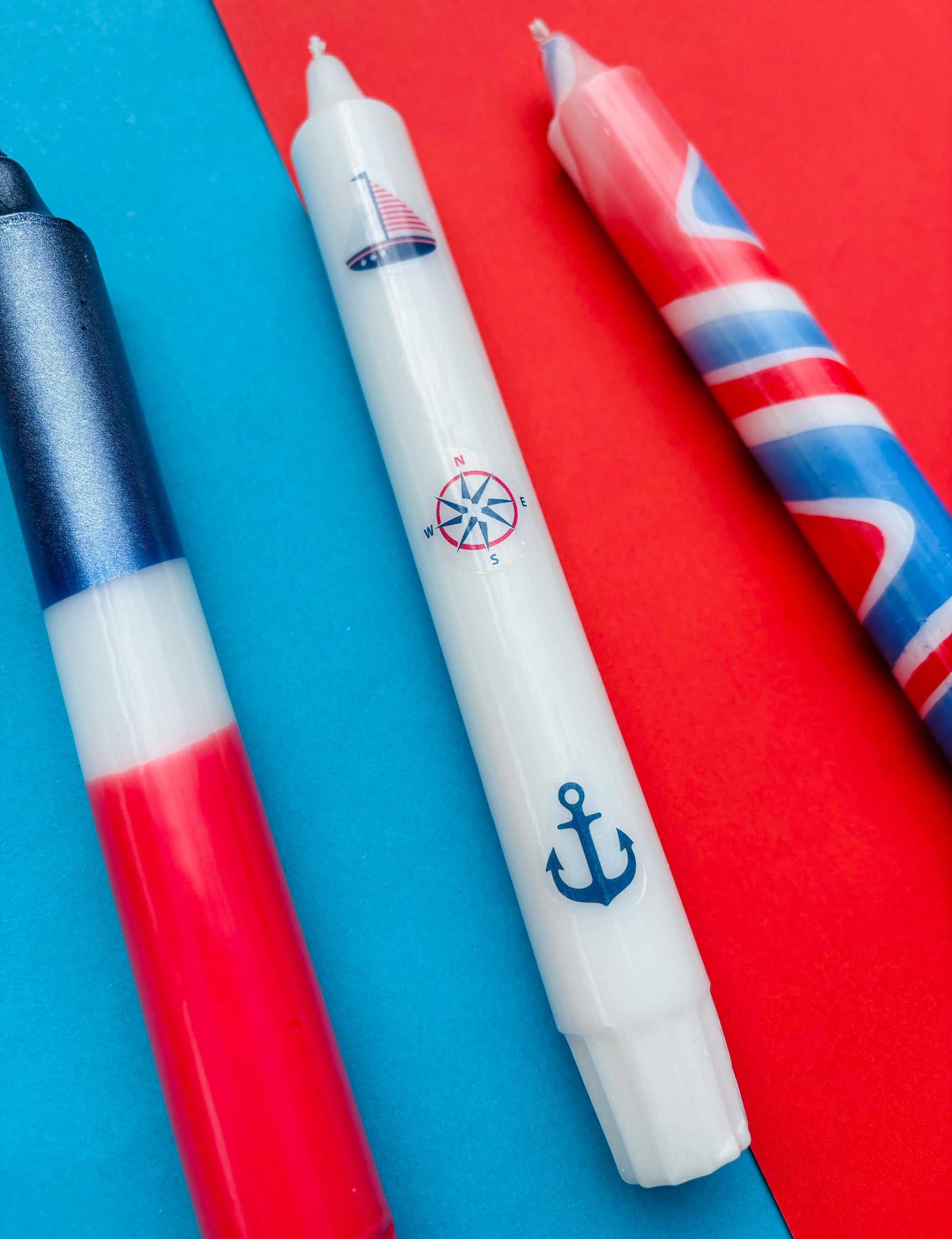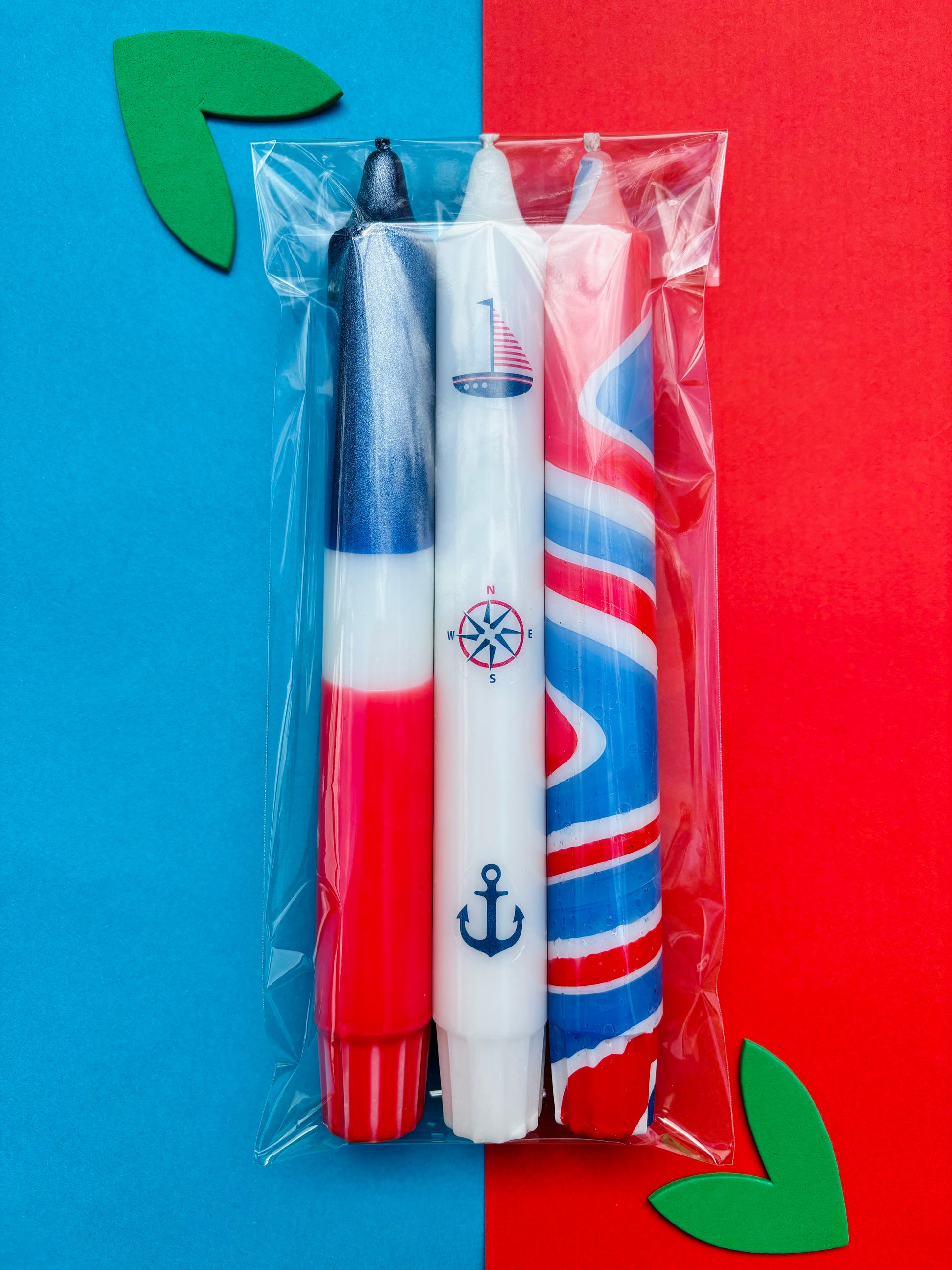 Bring the spirit of adventure into your home with this 3-pack of sailing-themed candles. Featuring classic nautical colors—navy blue, bright red, and white, decorated with little prints inspired by life at sea. These candles are a tribute to long summer days spent exploring the Swedish archipelago. Perfect as a centerpiece, a gift for boat lovers, or a reminder of your own island adventures.